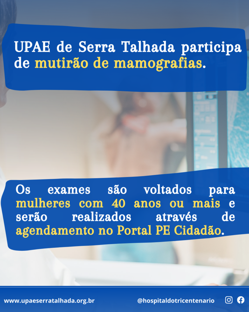 A Unidade Pernambucana de Atendimento Especializado (UPAE) Dr. José Alves de Carvalho Nunes, em Serra Talhada, faz parte do projeto do Governo do Estado, para a realização de um mutirão de mamografias. Os exames, que devem ser agendados através do Portal PE Cidadão (https://www.pecidadao.pe.gov.br/#/agendamento), são voltados para as mulheres com 40 anos ou mais e serão realizados gratuitamente. No dia do procedimento, é necessário comparecer na data e horário agendados, portando um documento original com foto, CPF original, cartão do SUS, comprovante de residência e o protocolo de agendamento. Após a realização da mamografia, a paciente deverá retirar o laudo, já impresso, na própria UPAE.