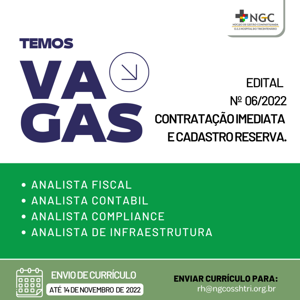 O Núcleo de Gestão Compartilhada da Organização Social de Saúde Hospital do Tricentenário, em Olinda, está com vaga disponível para as funções de: ANALISTA FISCAL, ANALISTA CONTABIL, ANALISTA COMPLIANCE e ANALISTA DE INFRAESTRUTURA. Os interessados em participar do processo seletivo devem encaminhar um currículo para o e-mail rh@ngcosshtri.org.br , até o dia 14 de novembro de 2022, com o assunto constando o nome completo do candidato e a função pleiteada. É importante seguir todas as orientações dispostas no EDITAL, que está disponível no Portal das Transparência da OSSHTRI, através do endereço https://htri.org.br/matriztransparencia/index.php/demonstracoes-contabeis/category/297-editais-2022 . O resultado final será divulgado no dia 22 de novembro de 2022.