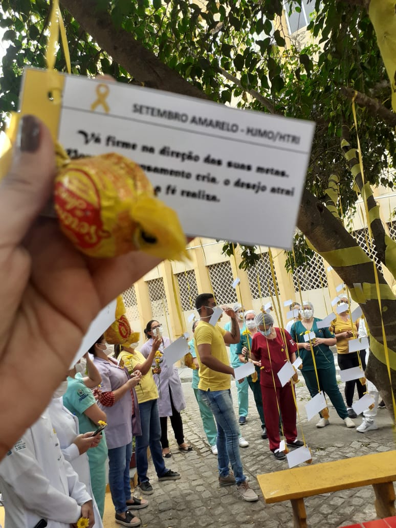 Nesta terça-feira (14), o Hospital João Murilo de Oliveira (HJMO), em Vitória de Santo de Antão, realizou dinâmicas com a temática voltada para a campanha do Setembro Amarelo, que tem como objetivo levar mais visibilidade e prevenir os casos de suicídio, realizadas pela psicóloga Geysa e o enfermeiro Renan. As ações foram voltadas para toda a equipe, que foi vestida com a cor amarela. A data ainda contou com a distribuição de mensagens motivacionais, flores, chocolates, muita alegria e, principalmente fé, sentimento fundamental para esse momento importante que o mundo está atravessando.