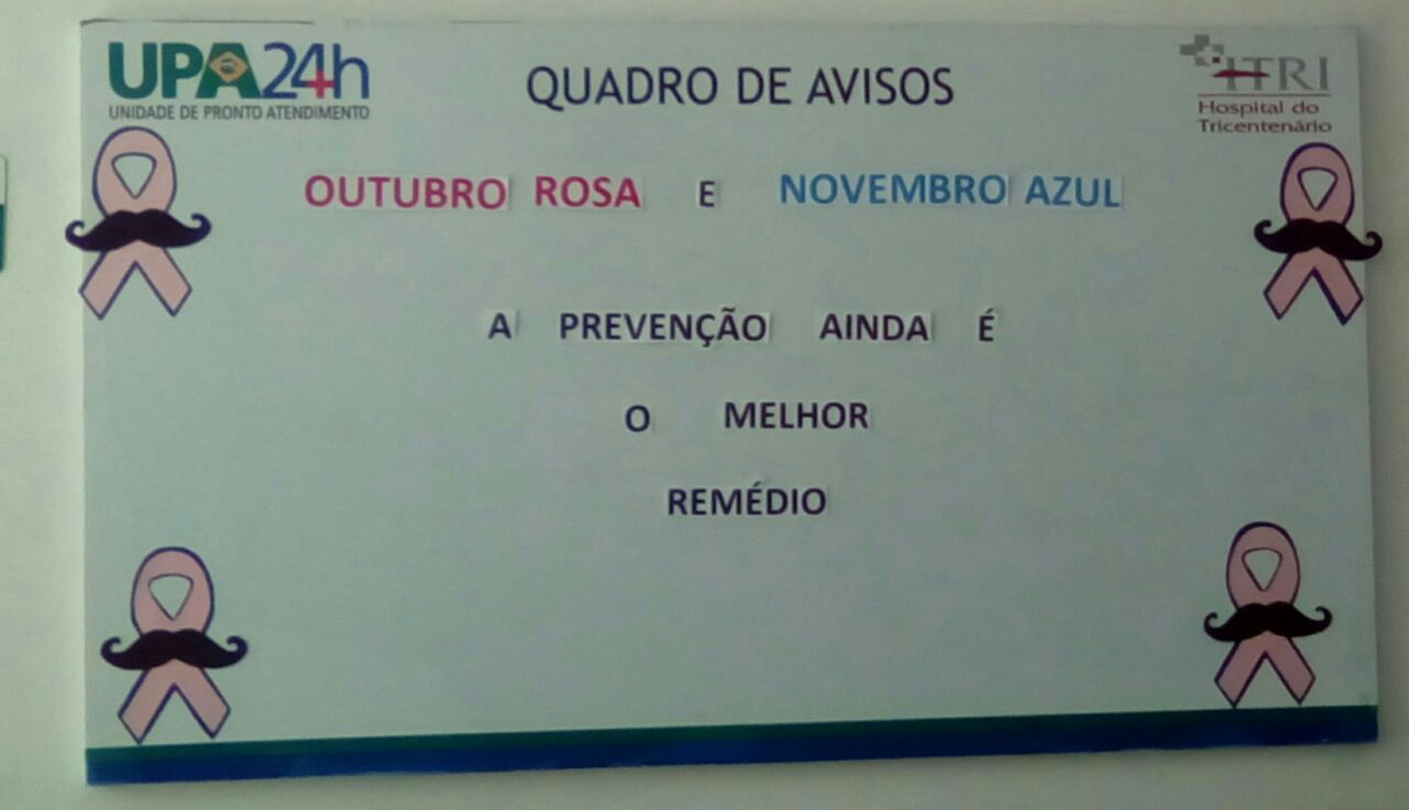 A prevenção ainda é a melhor solução para o combate ao câncer. A Unidade de Pronto Atendimento (UPA) Pediatra Zilda Arns, no Ibura, durante os meses de outubro e novembro preparou uma campanha conjunta para celebrar o Outubro Rosa e Novembro Azul, com treinamentos, palestras e decoração rosa e azul na Unidade.